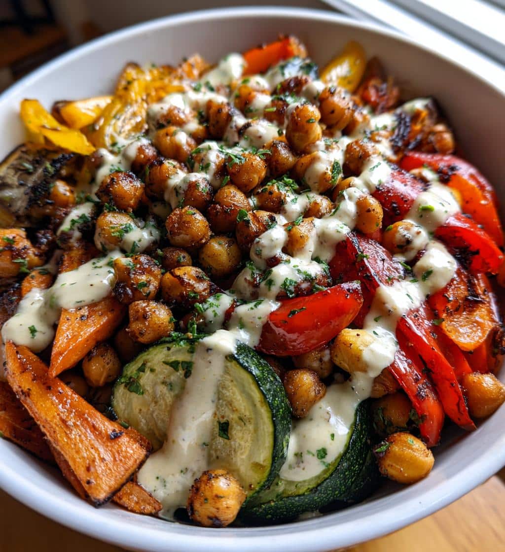 Roasted Veggie Chickpea Bowls with Sweet Maple Dijon Bliss