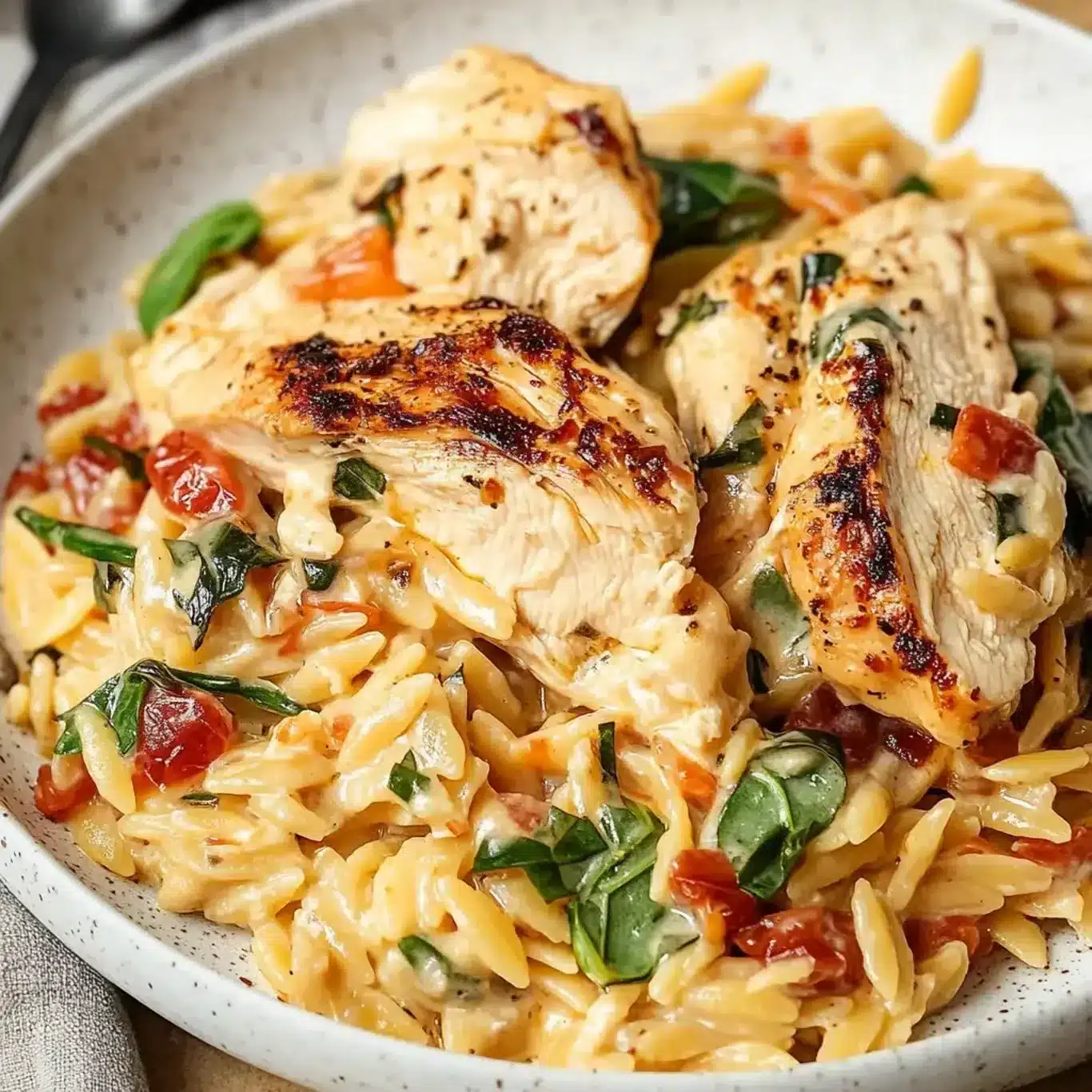 Para asegurar el mejor resultado, considera algunos puntos. Consumir el plato el mismo día garantiza su frescura. La textura del orzo y la cremosidad de la salsa son óptimas. Si necesitas recalentar, añade un poco de caldo. Esto ayuda a que la salsa no se seque. Mueve con frecuencia para que se caliente de manera uniforme. Los utensilios son importantes. Una sartén grande es indispensable. Te permitirá cocinar el pollo y el orzo cómodamente. También necesitas espacio para la salsa. Una espátula resistente es útil. Asegúrate de tener todo a mano. Esto hará que tu proceso de cocina sea más fluido. Un buen equipo facilita la preparación. Esto es muy útil en cualquier receta.